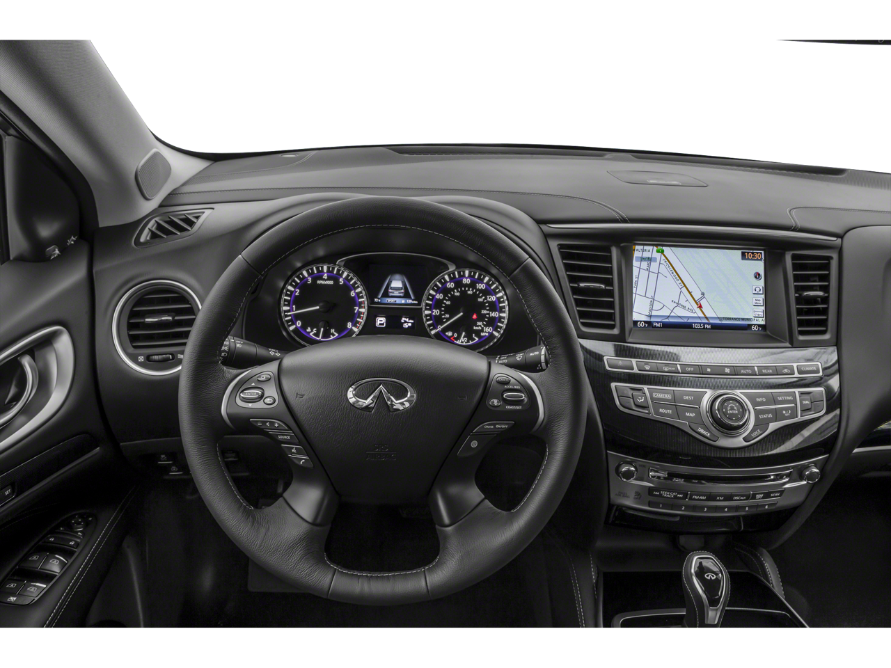 - Radio: AM/FM/CD/HD/MP3 Audio System -inc: 6 speakers w/playback capability, A/V USB ports x2 type A, Radio Data System (RDS), and speed-sensitive volume control, illuminated steering wheel-mounted audio controls, auxiliary A/V input jacks & 12-volts power outlet in front center console, INFINITI InTouch system w/8" color touch-screen display and voice recognition, SiriusXM radio w/3-month complimentary trial, SiriusXM Travel Link w/4-year complimentary trial access to weather, fuel prices, stock prices, sports scores and movie listings, Bluetooth® hands-free phone system and audio streaming, hands-free text messaging assistant and 6 USB charging ports: charge only, front center console, illuminated (2x - 1 type A & 1 type C), rear center console-mounted, illuminated (2x - 1 type A & 1 type C) non theater only, 3rd row (2x - type A)